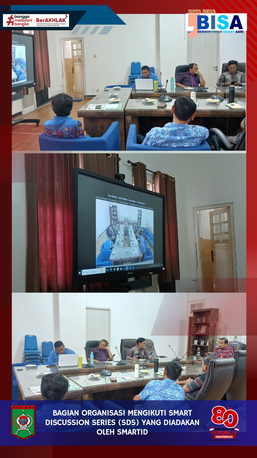Bagian Organisasi Sekretariat Daerah Kota Bima mengikuti kegiatan Smart Discussion Series yang diselenggarakan oleh SmartID melalui video conference (Vicom). Kegiatan tersebut berlangsung di Aula Parenta Kantor Wali Kota Bima dan diikuti langsung oleh Asisten Administrasi Umum Setda Kota Bima bersama seluruh jajaran Bagian Organisasi.